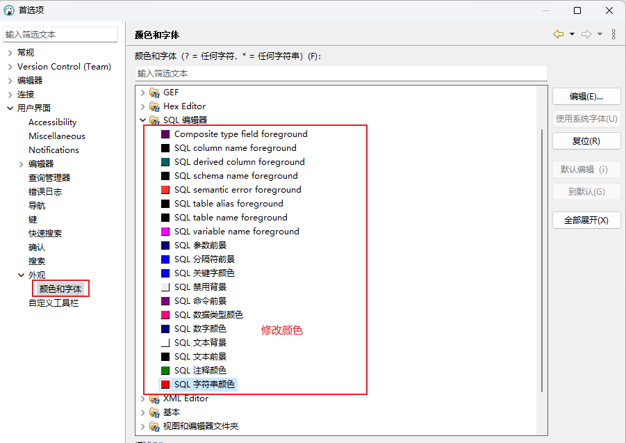 另外,DBeaver 默认情况下对代码关键字的着色与 SSMS 不一样,如果希望它尽可能地与 SSMS 保持一致,可设置合适的颜色,设置方法如下: