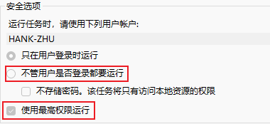设置时,不管用户是否登录都要运行,且使用最高权限运行。