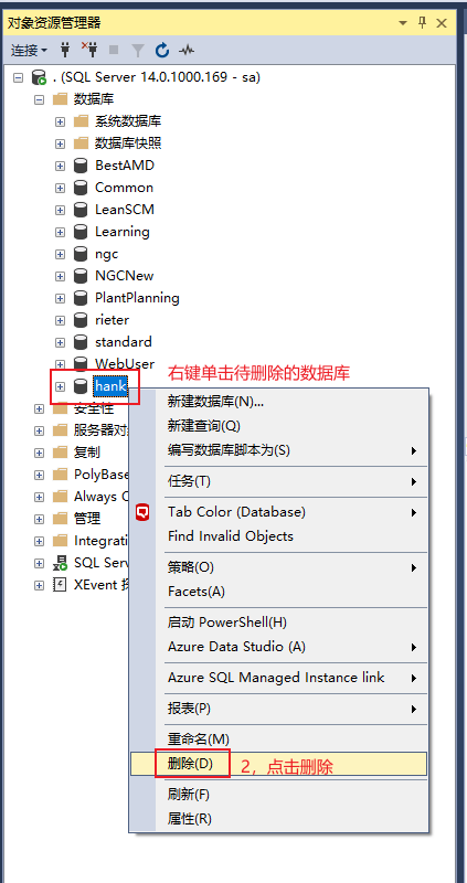 如果一个数据库不需要了,或者有了一个新的备份,在还原前,需把原来的数据库删除,再恢复数据库。删除数据库操作比较简单,但在删除前,需确认是否真的要删除,是不是要先备份一下。一旦删除将再有找不回来了。